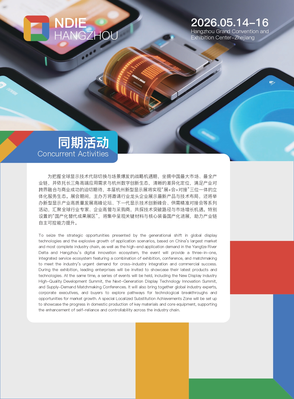 To seize the strategic opportunities presented by the generational shift in global display technologies and the explosive growth of application scenarios, based on China’s largest market and most complete industry chain, as well as the high-end application demand in the Yangtze River Delta and Hangzhou’s digital innovation ecosystem, the event will provide a three-in-one, integrated service ecosystem featuring a combination of exhibition, conference, and matchmaking to meet the industry’s urgent demand for cross-industry integration and commercial success. During the exhibition, leading enterprises will be invited to showcase their latest products and technologies. At the same time, a series of events will be held, including the New Display Industry High-Quality Development Summit, the Next-Generation Display Technology Innovation Summit, and Supply-Demand Matchmaking Conferences. It will also bring together global industry experts, corporate executives, and buyers to explore pathways for technological breakthroughs and opportunities for market growth. A special Localized Substitution Achievements Zone will be set up to showcase the progress in domestic production of key materials and core equipment, supporting the enhancement of self-reliance and controllability across the industry chain.